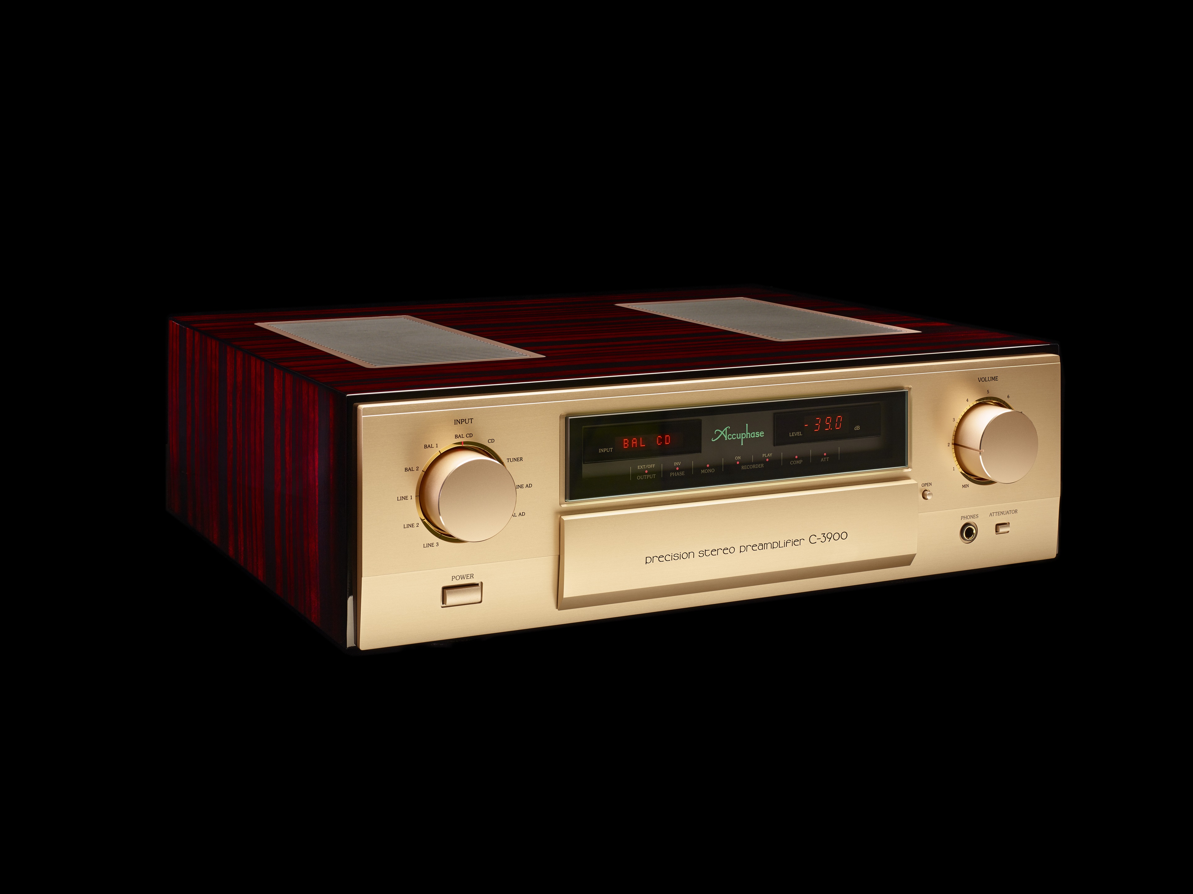 Auch im C-3900 kommt wieder die revolutionäre exklusive Accuphase AAVA-Lautstärkeregelung zum Einsatz und dieses in einer bisher noch nie zuvor gesehenen Güte! Im C-3900 werden gleich zwei „Balanced AAVA“-Einheiten parallel angesteuert. Im Ergebnis eine „Dual Balanced AAVA“! Diese extrem aufwändige Schaltung erreicht nochmal deutlich verbesserte elektrische Werte. Dank „Dual Balanced AAVA“, einer diskret aufgebauten Eingangsstufe mit Strom-Rückkopplungsprinzip und hohem Verstärkungsfaktor, sowie der ANCC-Technologie (Accuphase Noise and Distortion Cancelling Circuit) konnte im Vergleich zu Vorgängermodellen bereits sehr niedrige Rauschpegel um weitere 30 Prozent reduziert werden. Der Aufbau aller Verstärkerschaltungen erfolgt vom Eingang bis zum Ausgang streng kanalgetrennt. Mit Energie versorgt werden diese Baugruppen durch separate Netzteile für links und rechts. Für höchste Stabilität sorgen große Ringkerntrafos und insgesamt zwölf 10.000 μF Siebkondensatoren. Der aus einem hochsteifen Aluminiumblock gefräste und mit höchster Präzision verarbeitete Pegelsensor des C-3900, vermittelt ein äußerst sanftes Bedienungsgefühl. Der C-3900 verfügt über höchstwertigen Kopfhörerverstärker mit Gegentakt-Ausgangsstufe, um optimale Klangqualität für ein ungestörtes Hören zu ermöglichen. Selbstredend bietet der Vorverstärker eine sehr umfassende Ausstattung, eine elegante Front und ein wunderschönes Holzgehäuse und perfekt entkoppelnde „High Carbon“ Gerätefüße.